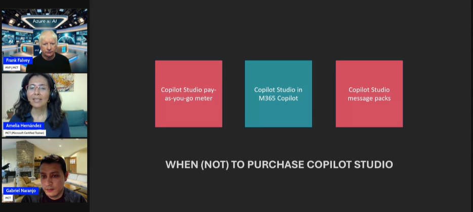 En una de estas sesiones hablamos sobre agentes en Microsoft y abordamos un tema tan necesario como poco habitual: cómo saber cuándo no tiene sentido adquirir licencias de Copilot Studio. Junto a Frank y Amelia Hernández Osorio, pusimos el foco en tomar decisiones informadas, entendiendo el contexto real de cada organización y evitando soluciones sobredimensionadas que no aportan el valor esperado.